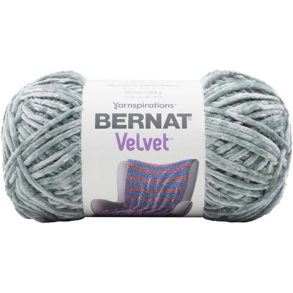 Bernat-Velvet. Bernat Velvet is an eye-catching yarn that works up into lush, velvety knit and crochet projects. Featuring a beautiful shine and classic shade range, Velvet is a soft choice for blanket and pillow projects for your home. Weight category: 5. Content: 100% Polyester. Putup: 10.5oz/300g, 315yd/288m. Gauge: 12 stsx17r = 4in/10cm on size US10.5/6.5 mm knitting needles. Crochet Tension: 10scx11r on USK/6.5 mm crochet hook. Dyelotted: We try but are not always able to match dyelots. Care: Hand wash, dry flat. Comes in a variety of colors. Each sold separately. Imported. Color: Smokey Green