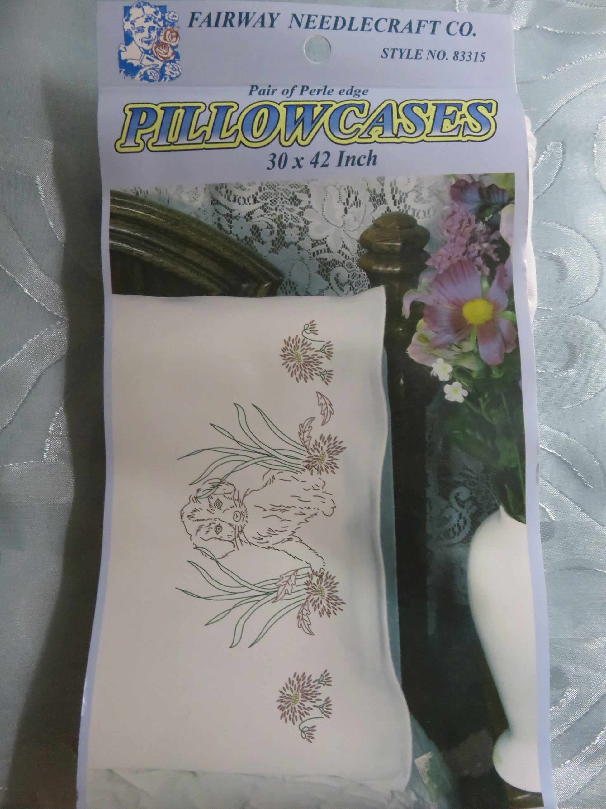 Pair of Perle Edge Pillowcases 30 x 42 inch. Made in USA Poly Cotton Material, Crease Resistant Fabric. Style 83315. Floss not included. Stamped ready for embroidery.