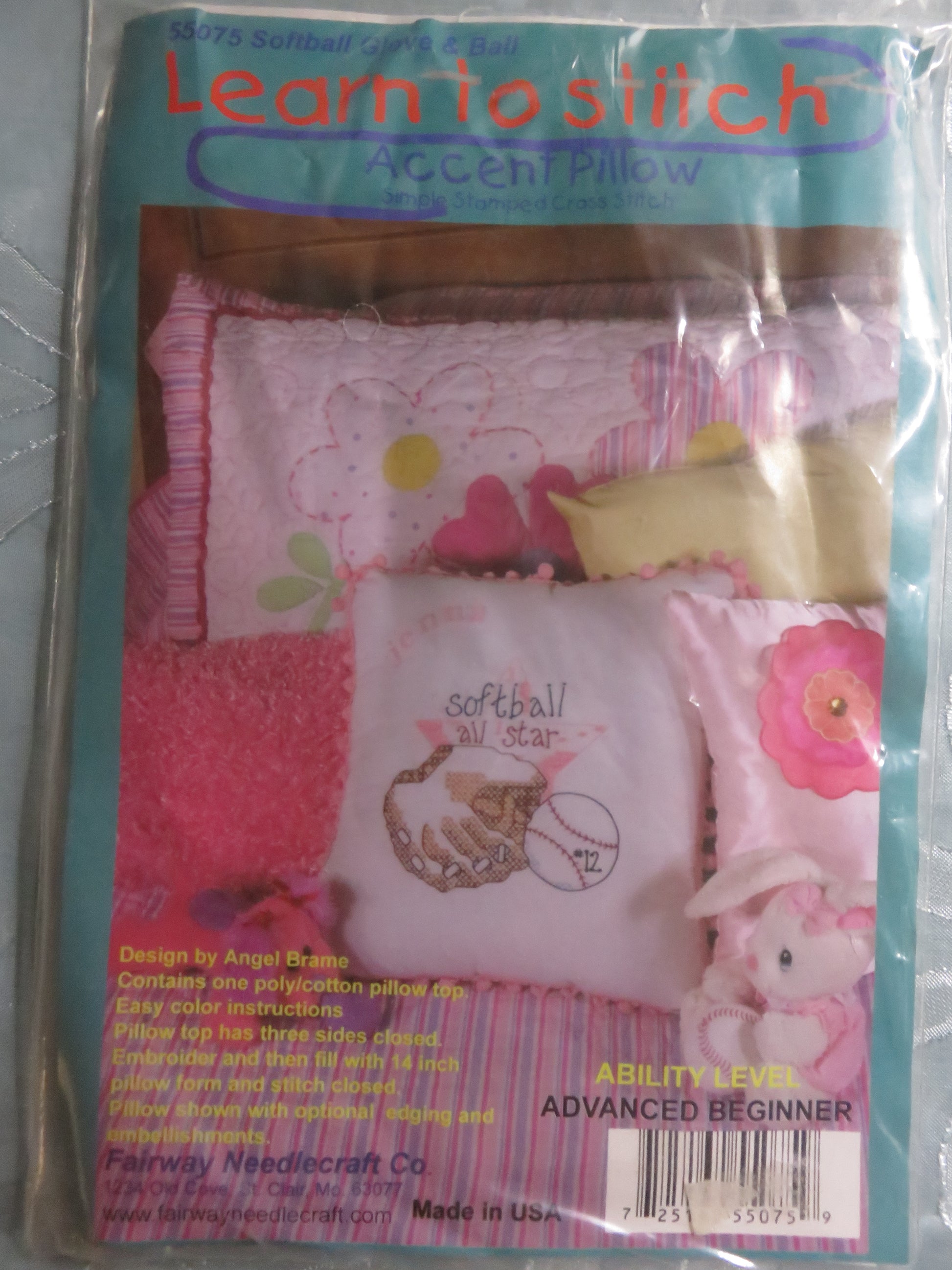 Learn to Stitch Accent Pillow embroidery block. Accent Pillow. Simple Stamped Cross Stitch. Pattern 55075 Softball Glove & Ball. Contains one poly/cotton pillow top. Easy color instructions. Pillow top has three sides closed. Embroider and then fill with 14 inch pillow form and stitch closed. Pillow shown with optional edging and embellishments. Made in USA. Floss, pillow form and edging not included.
