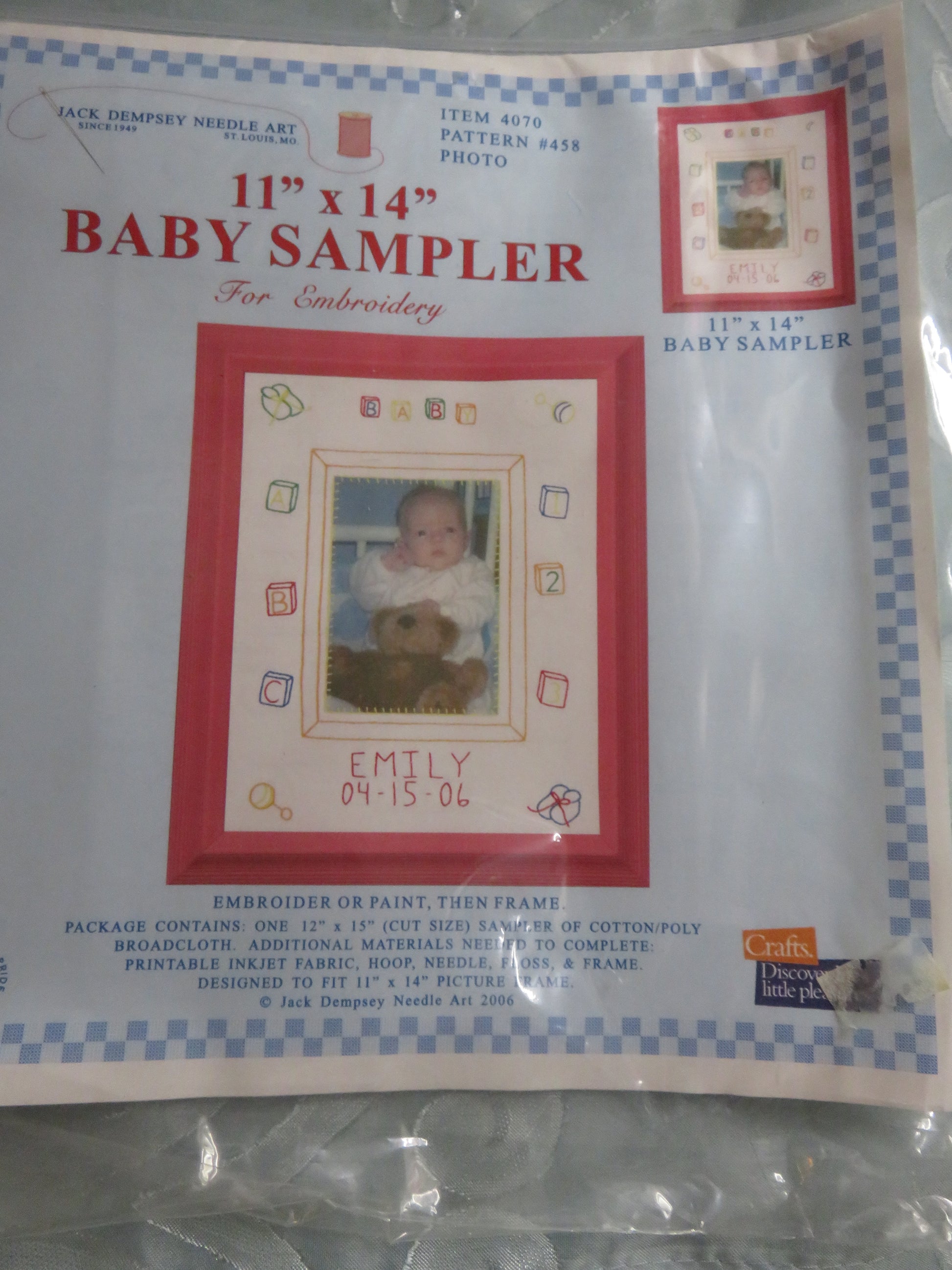 Jack Dempsey-Stamped White Quilt Blocks. The stitching designs have been stamped using ink that washes away with any liquid and the fabric is a cotton/poly blend broadcloth. This package contains 11" X 14" Baby Sampler for Embroidery, instructions for completion and care, and complete list of DMC floss requirements. Fabric, backing, batting, hoop, needle, thread, and floss all sold separately. Design: Birds. Made in USA. Item 4070 Pattern #458 Photo. Use your own photo.