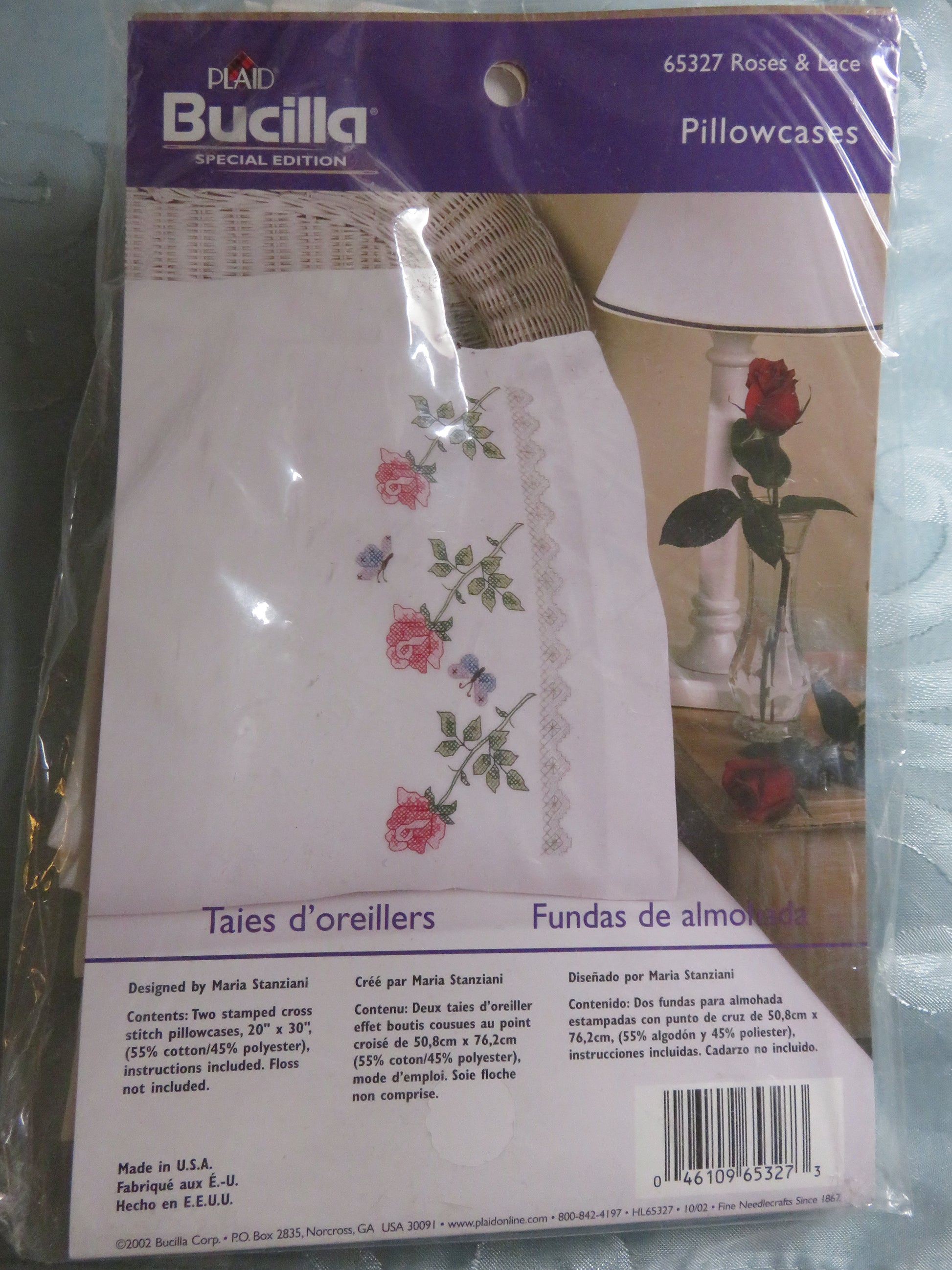 This kit contains two stamped cross stitch pillowcases pre-stamped in wash-away ink and a detailed list of floss requirements. Finishing materials are not included. Finished size: Pillowcase 20" x 30". 55"cotton/45"polyester. Design: 65327 Roses & Lace . Made in USA. Floss not included.