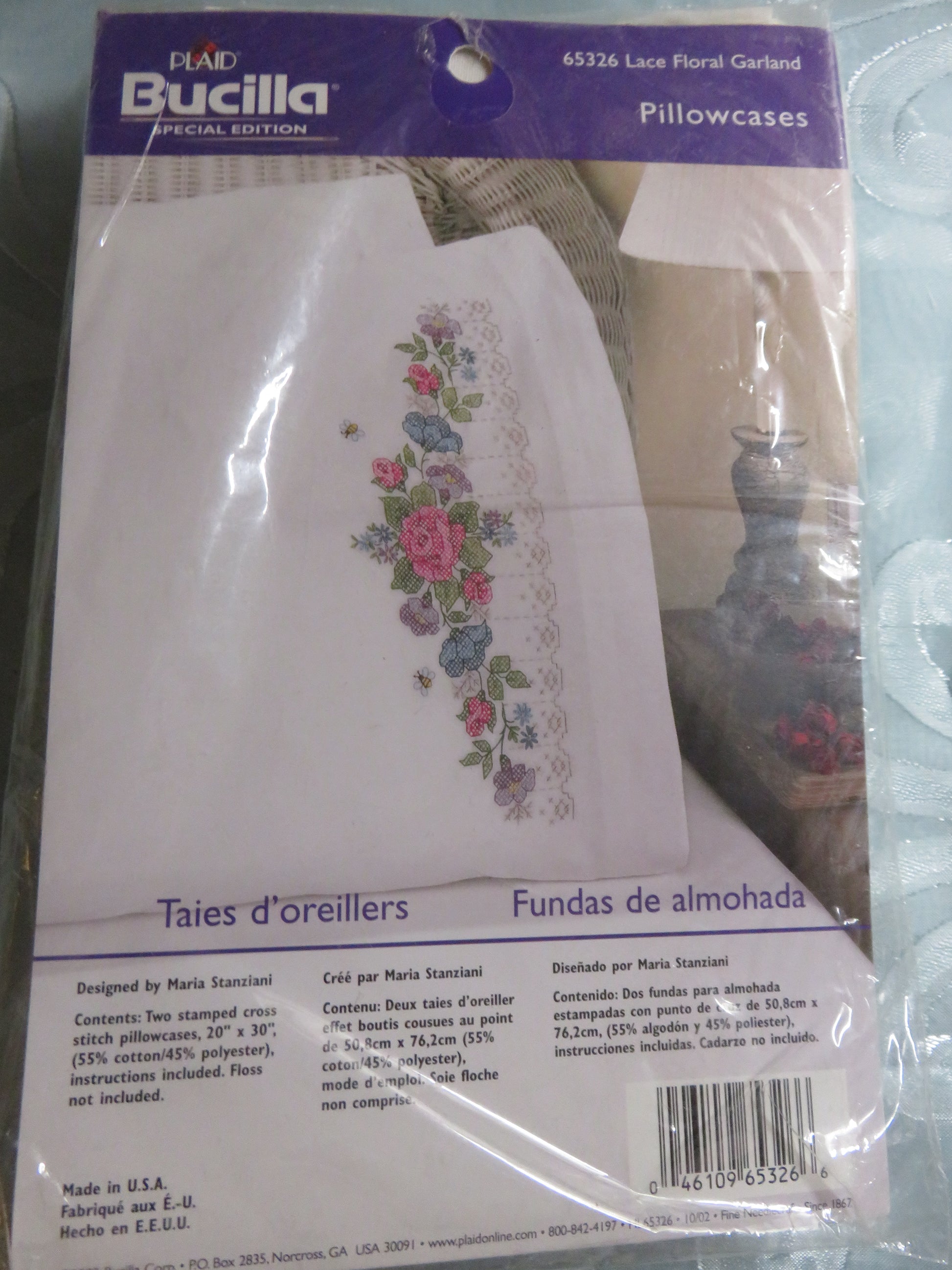This kit contains two stamped cross stitch pillowcases pre-stamped in wash-away ink and a detailed list of floss requirements. Finishing materials are not included. Finished size: Pillowcase 20" x 30". 55"cotton/45"polyester. Design: 65326 Lace Floral Garland . Made in USA. Floss not included.