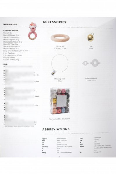 Teething rings call for a wooden ring to wrap around. For the mobile, you'll want a metal ring (for hanging toys from), bells, and a pompon maker kit, available from Ricorumi!