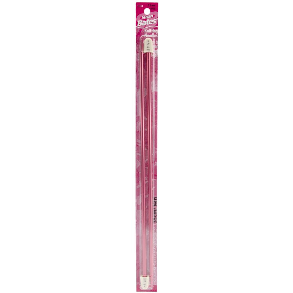 Susan Bates Silvalume lightweight aluminum 14-inch Knitting Needles feature a non-rolling knob design along with color coded sizes for quick identification. Straight needles are perfect for creating flat knitted projects or pattern pieces. This package contains one pair of 14-inch single point knitting needles. Size: 15/10mm. Imported.